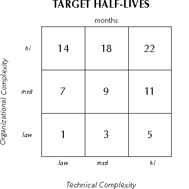 The Half-life/Complexity Matrix©by Arthur M. Schneiderman If you are using a state-of-the-art improvement process, you should be able to close the gap between your current performance and the ultimate process capability at a constant rate given by the process half-life. The half-life is not the same for all processes. Instead, it depends on the complexity of the process. There are two dimensions to complexity: technical and organizational. Technical complexity is high for new technologies, where part of the learning process is related to understanding and refining that technology. Over time, as the technology matures and its use becomes more routine and familiar, technical complexity declines. It is the nature of business evolution that we are constantly dealing with a mix of old and new technologies. Organizational complexity arises when a process has linkages (intermediate inputs and/or outputs) to processes outside of its boundaries. These processes may be internal or external (outside suppliers or customers) to the organization. The linkages may be one-way or two-way, one time or interactive, routine or requiring real-time negotiation. So processes can run the full organizational gambit, from completely self contained (uni-functional) to cross-functional or cross-organizational. We would expect the rate of improvement to slow as the cultures, goals and objectives of the various players come into potential conflict. By sorting the improvement efforts that I studied into the nine bins formed by classifying each in terms of the process's apparent organizational and technical complexity (low, medium or high), I arrived at the following matrix of average half-lives: