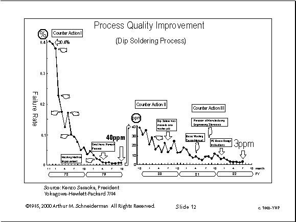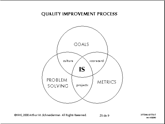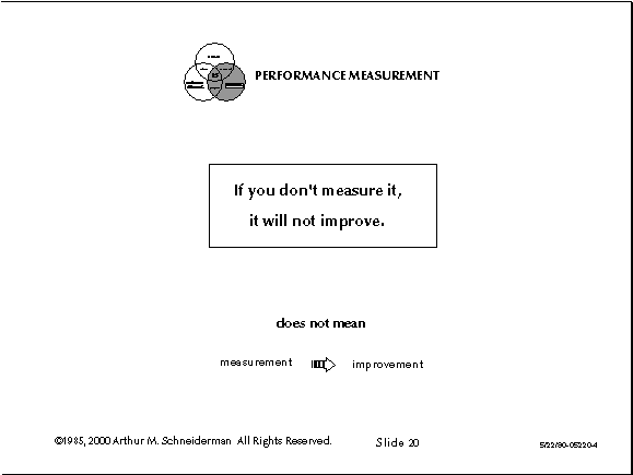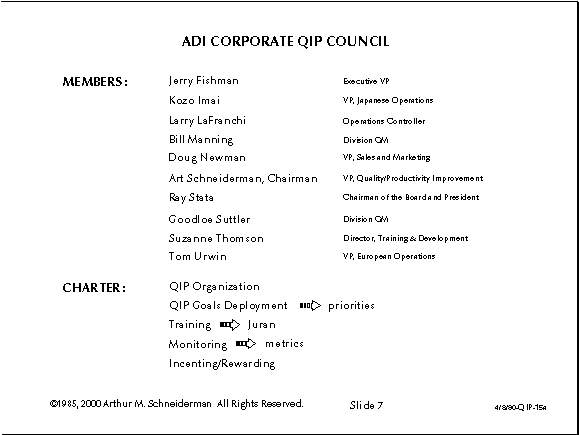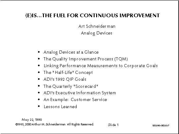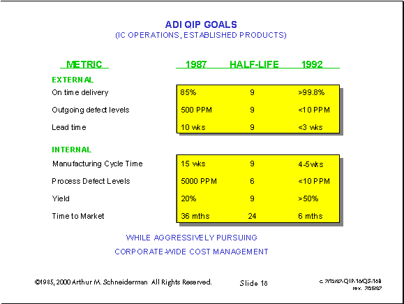 This slide stressed the importance of metrics and goals in Analog’s implementation of TQM. I also stressed that although they were necessary, they were not sufficient to assure achievement of our overall business objectives. In later versions of this slide, I added: “If you don’t monitor it, it will get worse” to emphasize the importance of integration of measurement into the normal management systems.