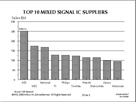 This slide was used to demonstrate the changing nature of Analog’s competition. In previous years, our major competitors were much smaller companies (Burr-Brown, Precision Monolithics, Crystal, Linear Technology, etc.), but as the technology changed, so did the competition. Now it included the powerhouse global semiconductor companies.