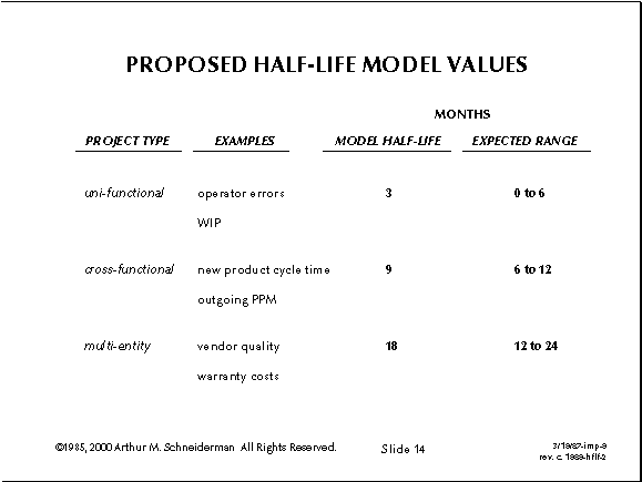Clicking on any of the numbers in the previous slide (here it’s “not late” for the entire corporation) produces this standardized view. The metric is broken down by business unit (each column) and shows the most recent twelve months of results. The green “control limits” identify the band of statistical insignificance in month-to-month variation. The red line is a fit of my half-life model to the data. The resulting half-life is shown at the bottom of each column. If the half-life is statistically insignificant (r2< .3), the letters NS (i.e. not significant) appear in place of a numerical value. If the half-life is negative or greater than 5 years, than NA (for not applicable) appears. Clicking on a half-life value produces the next slide.