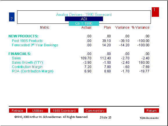 This is page one (of two) of the first screen in the resulting system. It’s the Corporate Balanced Scorecard for the first quarter of 1990. I refer you to the working model of Pilot for a detailed description of the navigation rules for the system. The next slide contains the second page. Two pages (rather than the one page I normally required) were necessary to assure legibility on all of our computer monitors. Today, both screens would easily fit on a single page. From the original creation of these data in late 1986/early 1987, I was sent each month a set of transparencies of the major “screens” in the system. I would replace the old ones withy the new ones, so that I could always show people our latest results. This, and the following slides represent a snapshot of the contents of my “transparency folder” as of April 1990. I brought it to all meetings and could quickly retrieve the appropriate data when it was appropriate.