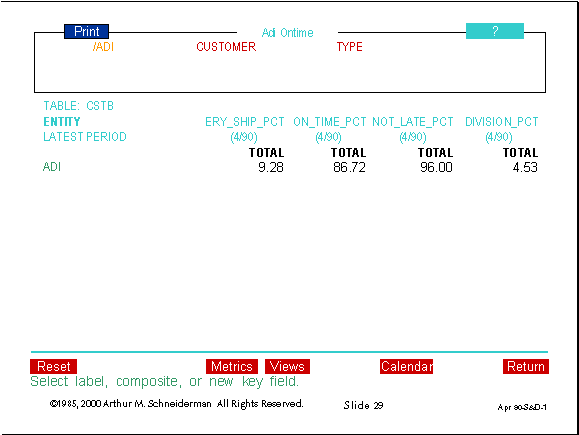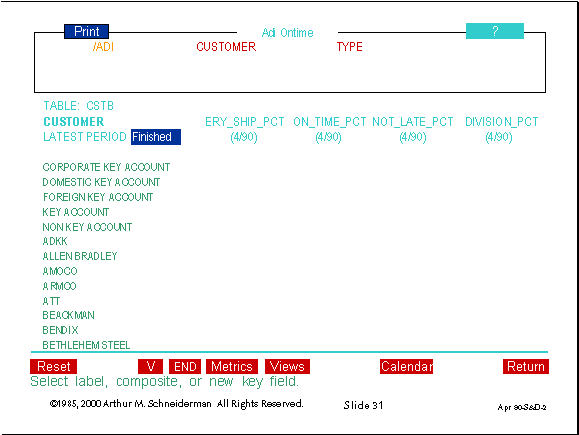 Our system was not only an EIS with predetermined views, but also a data warehouse where a wide variety of measures could be viewed through a process call “slice and dice.” The user specified the Analog business unit, specific customer (if in the top 400) or customer category, product or product category, and time frame and then chose from a large variety of order fulfillment process measures.