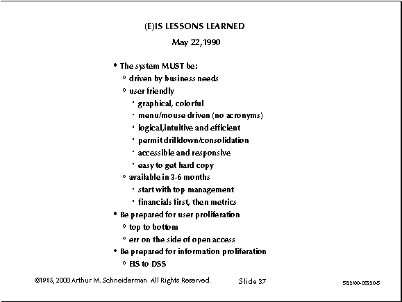 I made this slide, the final slide in my presentation, after our newly hired CIS Director met with me and complained about my role in championing our purchase of PILOT’s EIS. He made the first statement in no uncertain terms. My response, the second quote, was instantly rebuffed. The “IS curtain,” which had all but disappeared, instantly returned. I hope that some of his counterparts in the audience had a more favorable reaction to this slide and to our team’s accomplishment. I am certain that without our customer-supplier partnership the resulting output would have been far less useful. | |||||||||