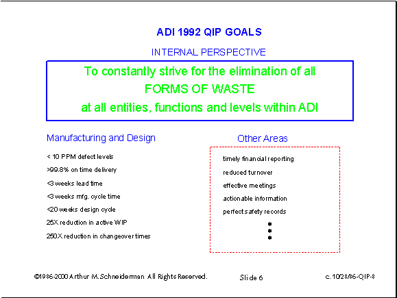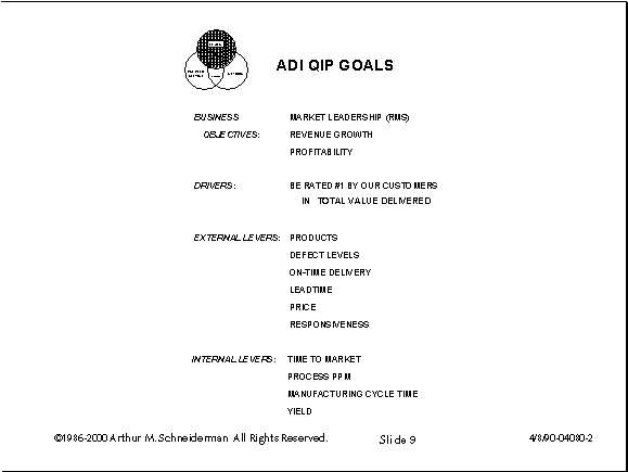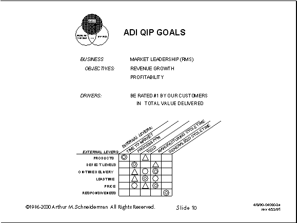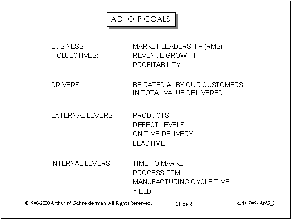 In January of 1989, I combined the previous two slides onto a single slide, pared the drivers down to the vital few and added the three business objectives.
