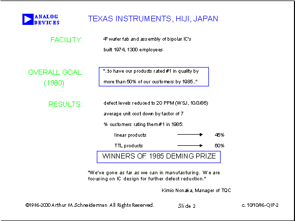 c. October 10, 1986 Analog's tool for telling the scorecard story originated in 1986; upon my return form Juran's Impro 86. I was inspired by a booth and presentation given by Texas Instruments' Hiji Japan wafer fab. I summarized their story on this single slide.