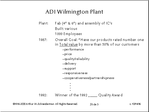 From a hand drawn slide presented October 14, 1986. I created this fictitious version were I adapted the original to Analog's largest, and a strikingly similar, wafer fab. The message was clear: here's a possible future state for Analog, and ... someone's already there. This instantly reduced my proposal from a consultant’s pipedream to a realistic possibility. The excitement that these two slides produced, prompted me to create a third version that applied to Analog's IC operations in total.