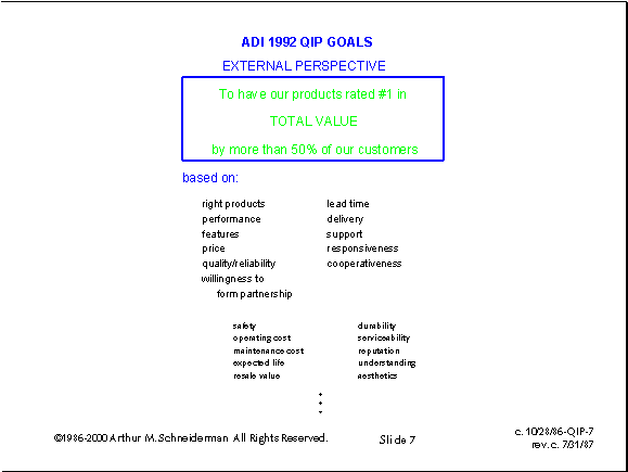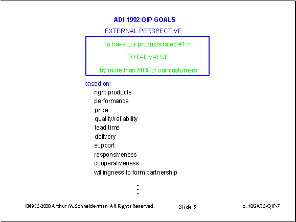 c. October 28, 1986. This and the following slide resulted from the meeting of 10/14/86 between Ray, Jerry and me, and incorporates our improvement of the previous two strawman proposal slides. The external perspective is the way that ADI appears to its customers. It is the way that they would describe us if they were asked to give a reference. All of these attributes are measurable by the customer.